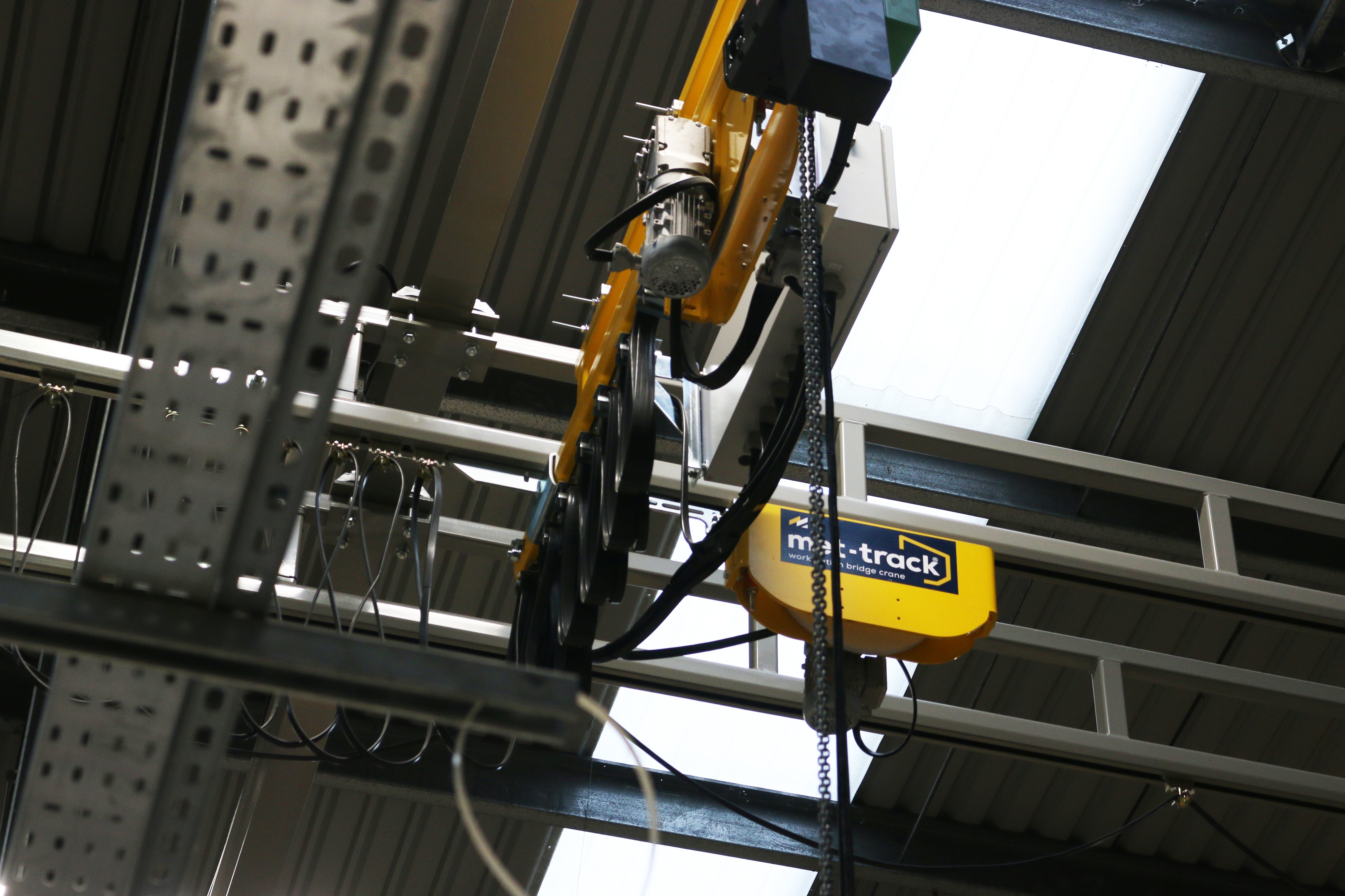 Metreel designed, manufactured, and installed three Met-Track® workstation bridge cranes. All cranes featured a 500kg safe working load (SWL) and powered travel with electric festoon bridges. Maximum floor space for task fluidity was crucial, and with this in mind, Metreel designed a special crane to provide this.